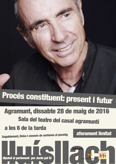 El diputat de Junts pel Sí i president de la Comissió del Procés Constituent al Parlament de Catalunya, el cantautor Lluís Llach, oferirà una conferència el pròxim dissabte 28 de maig a les 6 de la tarda a la Sala del Teatre del Casal Agramuntí. Llach explicarà en quin punt es troba el procés constituent que s'està duent a terme des del Parlament de Catalunya així com les eines d'estat que s'estan implementant per a la futura creació de la República Catalana.